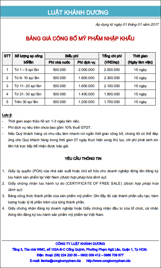 Hãng Luật Khánh Dương cung cấp bảng giá dịch vụ Công bố mỹ phẩm nhập khẩu và sản xuất trong nước, liên hệ luật sư tư vấn qua Hotline: 0986 708 677