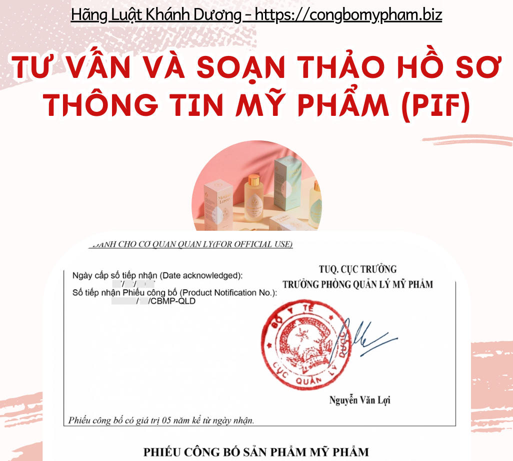 Hãng Luật Khánh Dương là đơn vị có hơn 15 năm kinh nghiệm trong lĩnh vực công bố mỹ phẩm trọn gói và cung cấp các dịch vụ liên quan như soạn PIF, CFS, giấy phép sản xuất mỹ phẩm, khách hàng vui lòng liên hệ Hotline: 0986 708 677